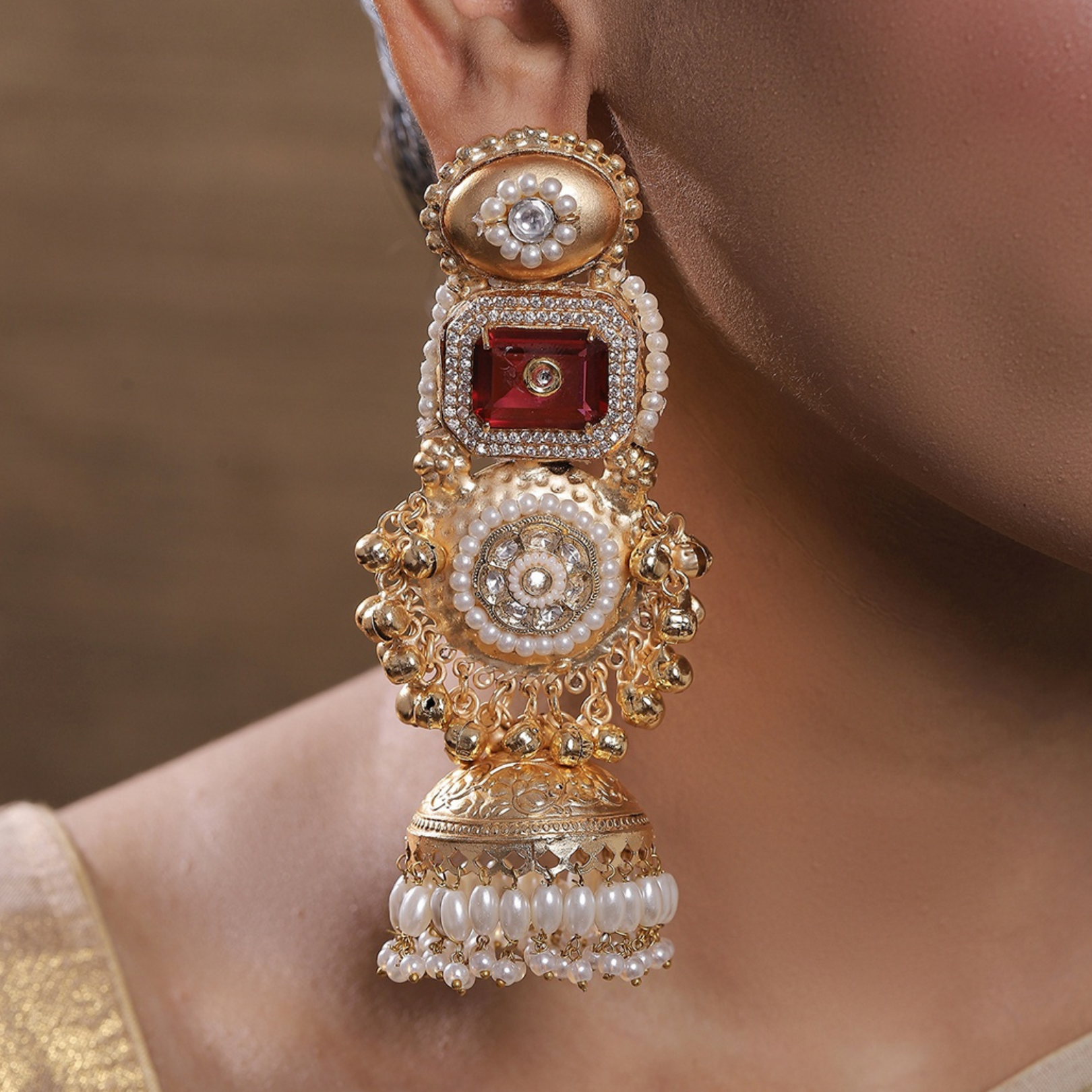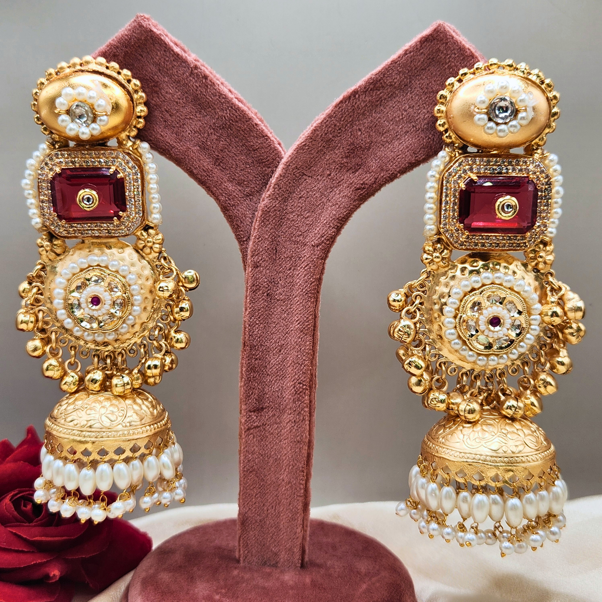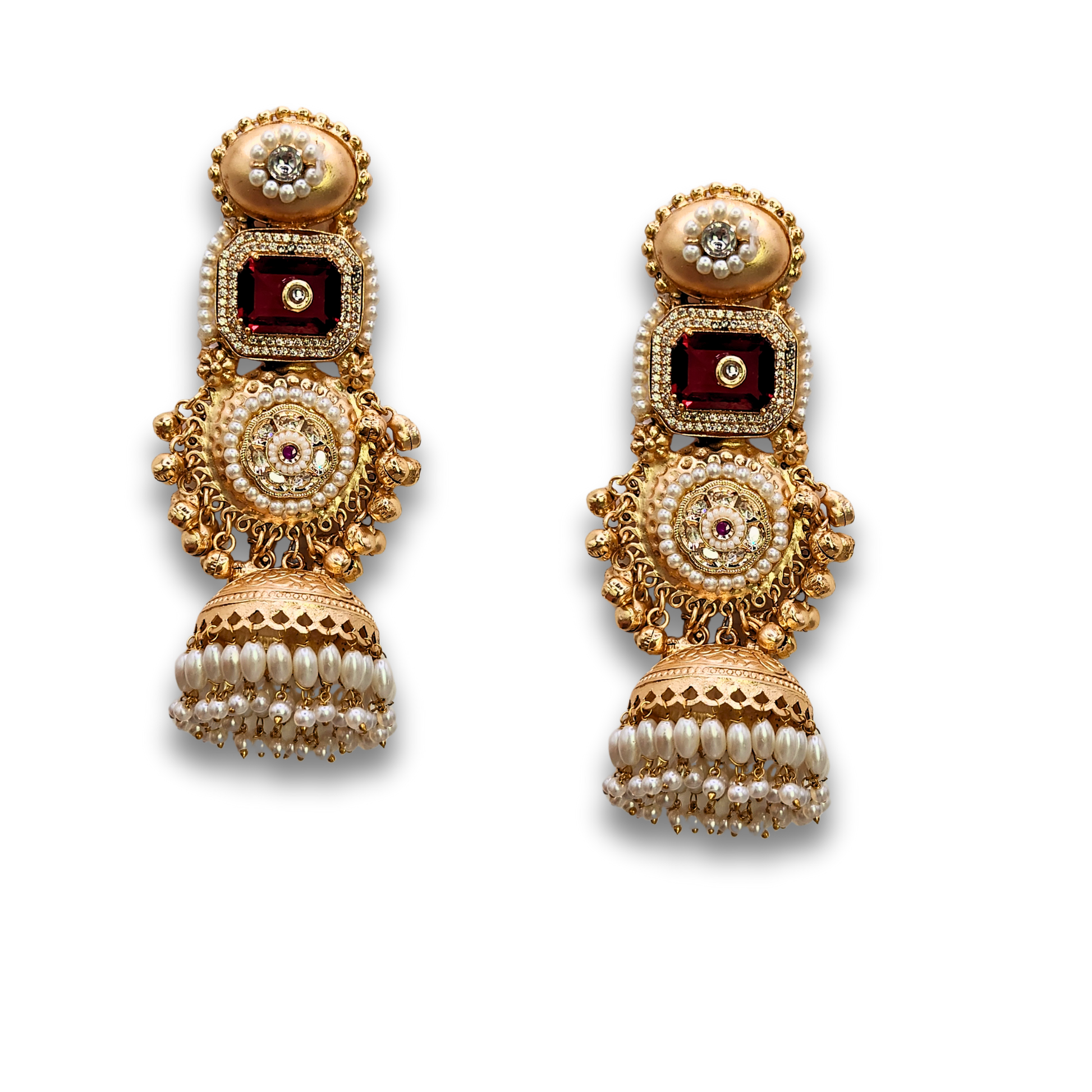 Discover the epitome of traditional Kashmiri craftsmanship with these magnificent jhumka earrings from VIANA JEWELS. These statement pieces showcase exquisite artistry through their multi-tiered design, featuring an elegant dome-shaped structure adorned with intricate details. The earrings combine antique gold-plated finish with beautiful ruby-red stones and pearl embellishments, creating a luxurious aesthetic. Each piece is masterfully crafted with green enamel work, delicate pearl drops, and decorative chains that add movement and grace. The jhumkas feature a sophisticated combination of prong-set stones, traditional peacock motifs, and cascading golden bells that create a subtle, melodious effect when worn. Measuring 7.5 cm in length and 3.5 cm in width, these earrings make a bold yet elegant statement. The push-back closure ensures secure wearing, while the lightweight design (50 grams) provides comfort during extended wear. Perfect for festivals, wedding ceremonies, and traditional celebrations, these versatile jhumkas complement both classic ethnic wear and contemporary fusion ensembles. The detailed filigree work and vintage-inspired finish make these earrings a timeless addition to any jewellery collection.