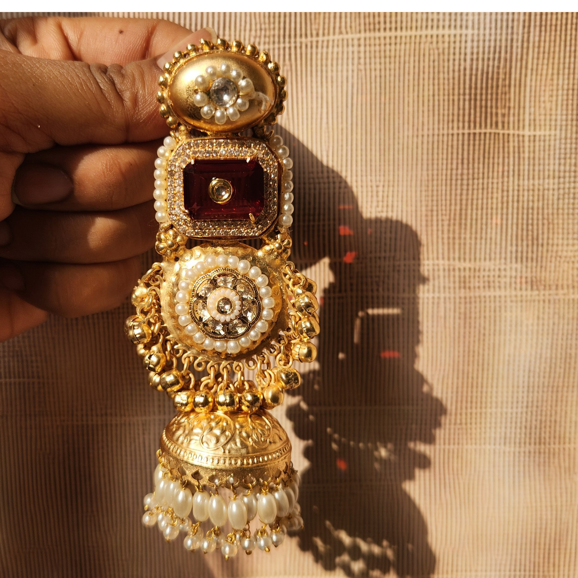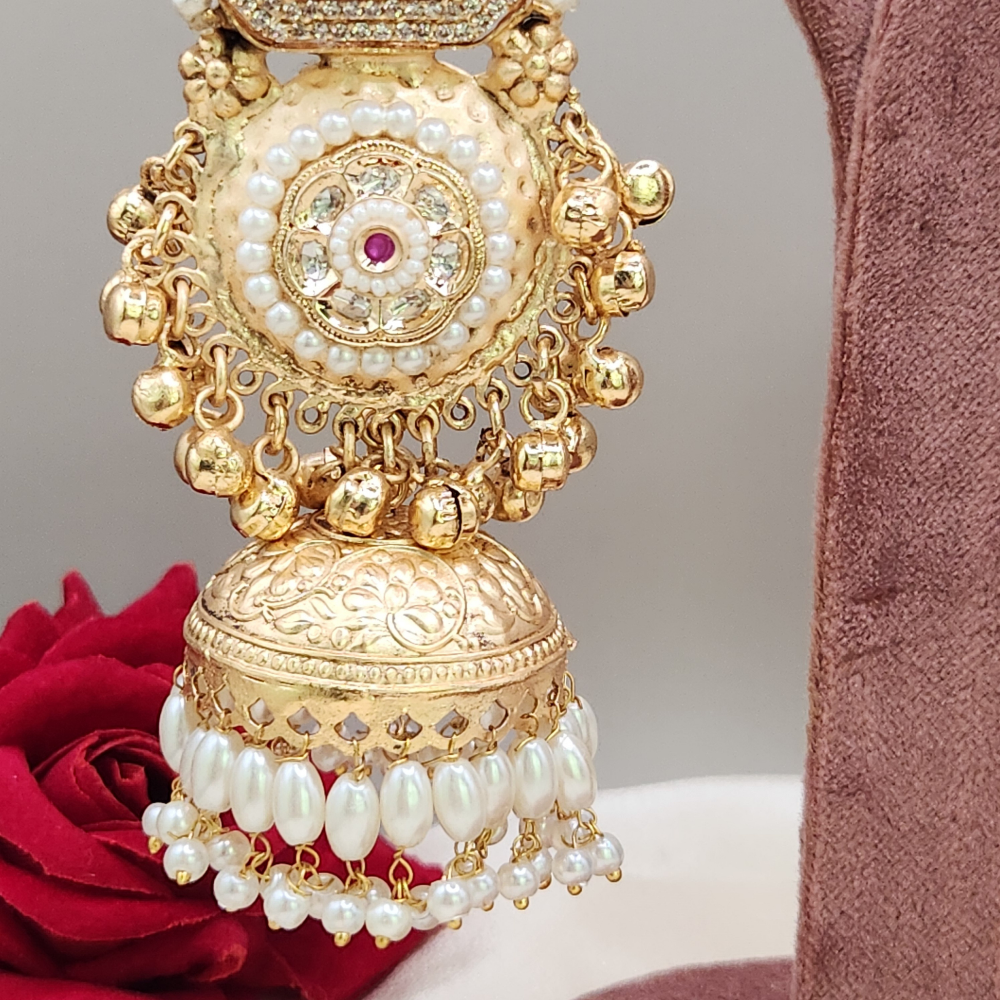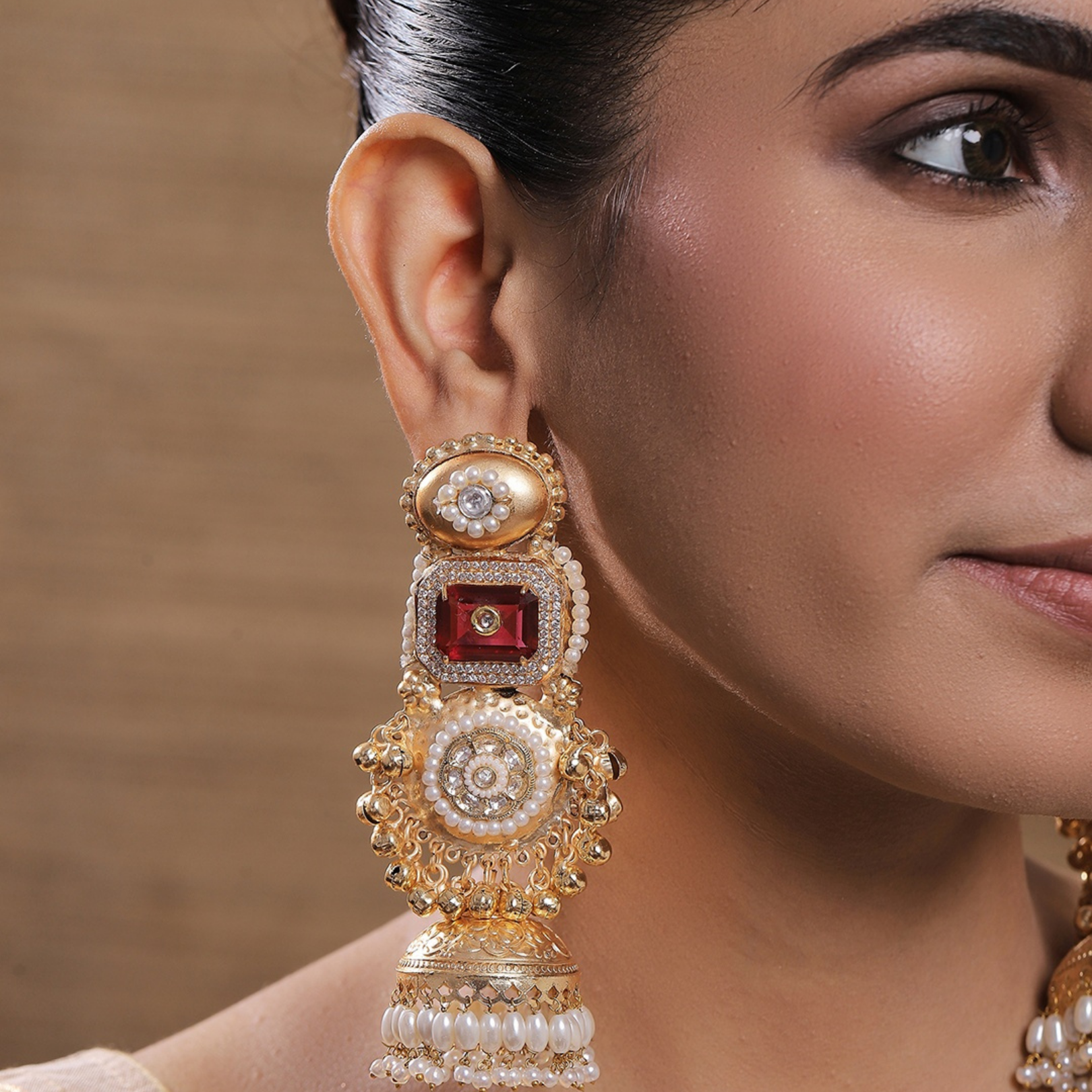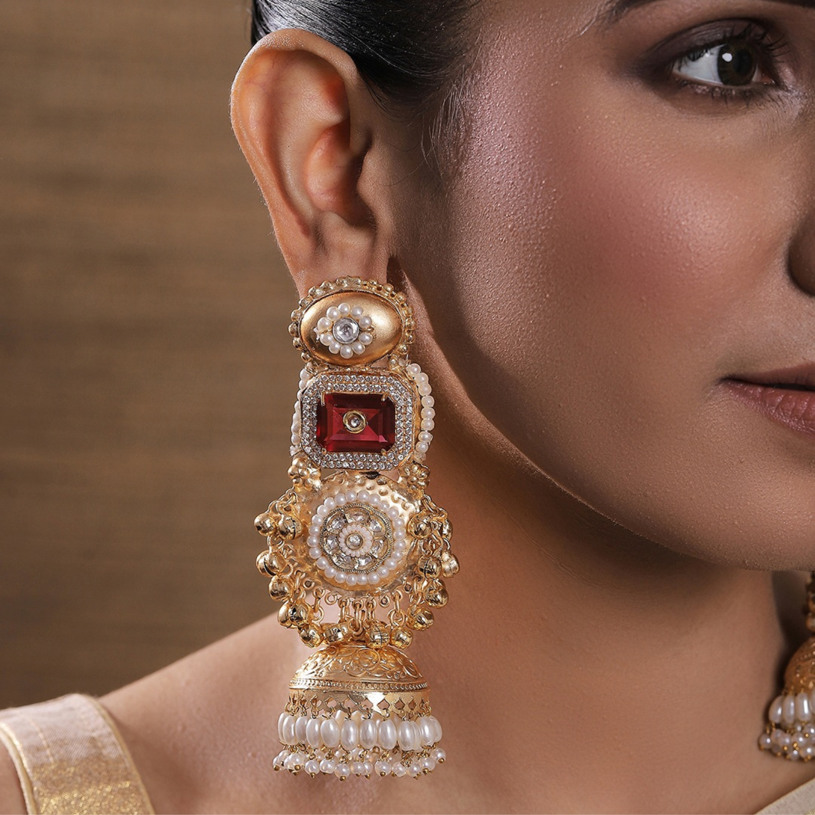 Discover the epitome of traditional Kashmiri craftsmanship with these magnificent jhumka earrings from VIANA JEWELS. These statement pieces showcase exquisite artistry through their multi-tiered design, featuring an elegant dome-shaped structure adorned with intricate details. The earrings combine antique gold-plated finish with beautiful ruby-red stones and pearl embellishments, creating a luxurious aesthetic. Each piece is masterfully crafted with green enamel work, delicate pearl drops, and decorative chains that add movement and grace. The jhumkas feature a sophisticated combination of prong-set stones, traditional peacock motifs, and cascading golden bells that create a subtle, melodious effect when worn. Measuring 7.5 cm in length and 3.5 cm in width, these earrings make a bold yet elegant statement. The push-back closure ensures secure wearing, while the lightweight design (50 grams) provides comfort during extended wear. Perfect for festivals, wedding ceremonies, and traditional celebrations, these versatile jhumkas complement both classic ethnic wear and contemporary fusion ensembles. The detailed filigree work and vintage-inspired finish make these earrings a timeless addition to any jewellery collection.