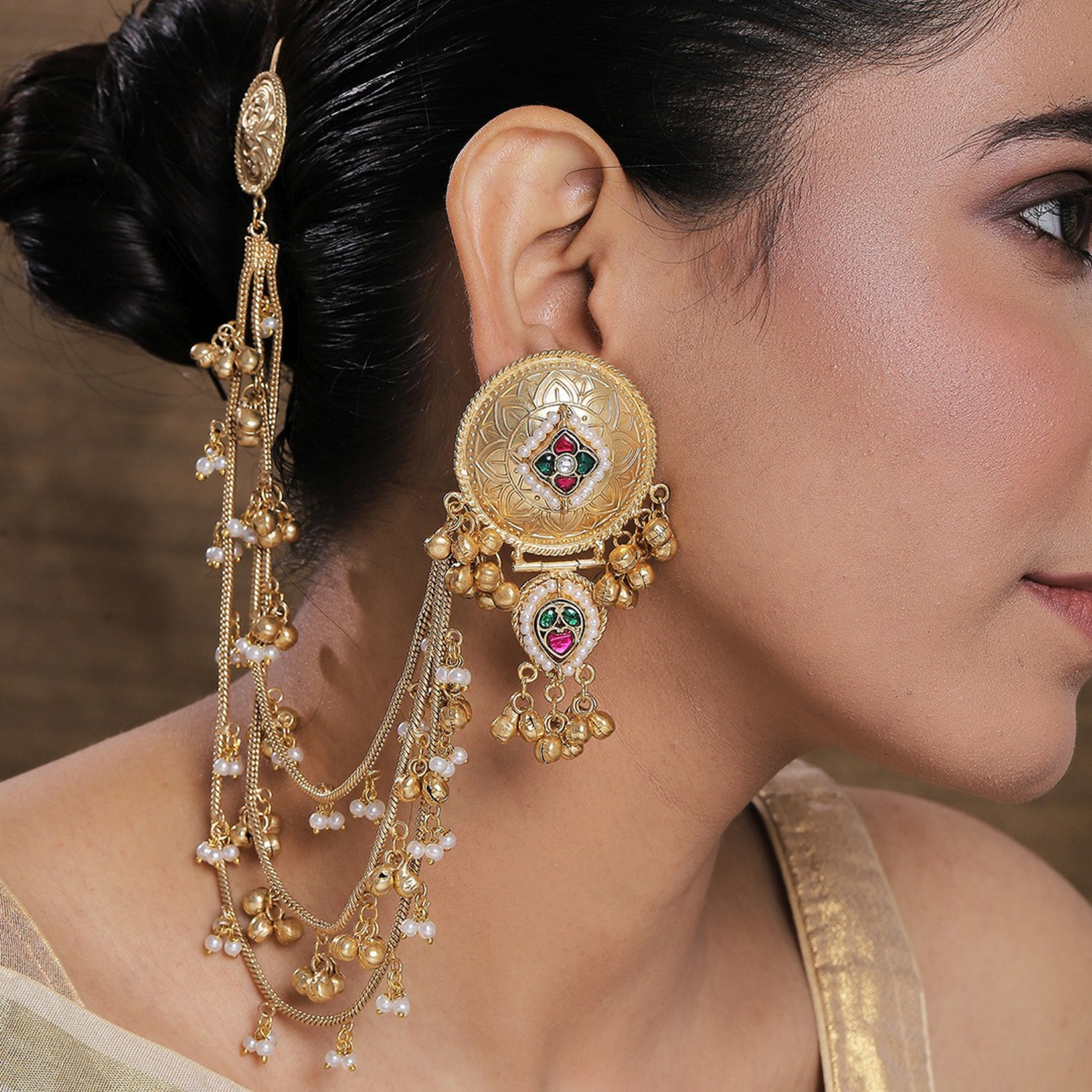Discover the beauty of traditional Kashmiri jewelry with our Aisha Kashmir Kaan Chain Jhumka. Made from high-quality materials, this intricately designed earring features a delicate chain connecting the jhumka to a loop that can be worn on the ear. Add a touch of elegance and cultural flair to your accessory collection.