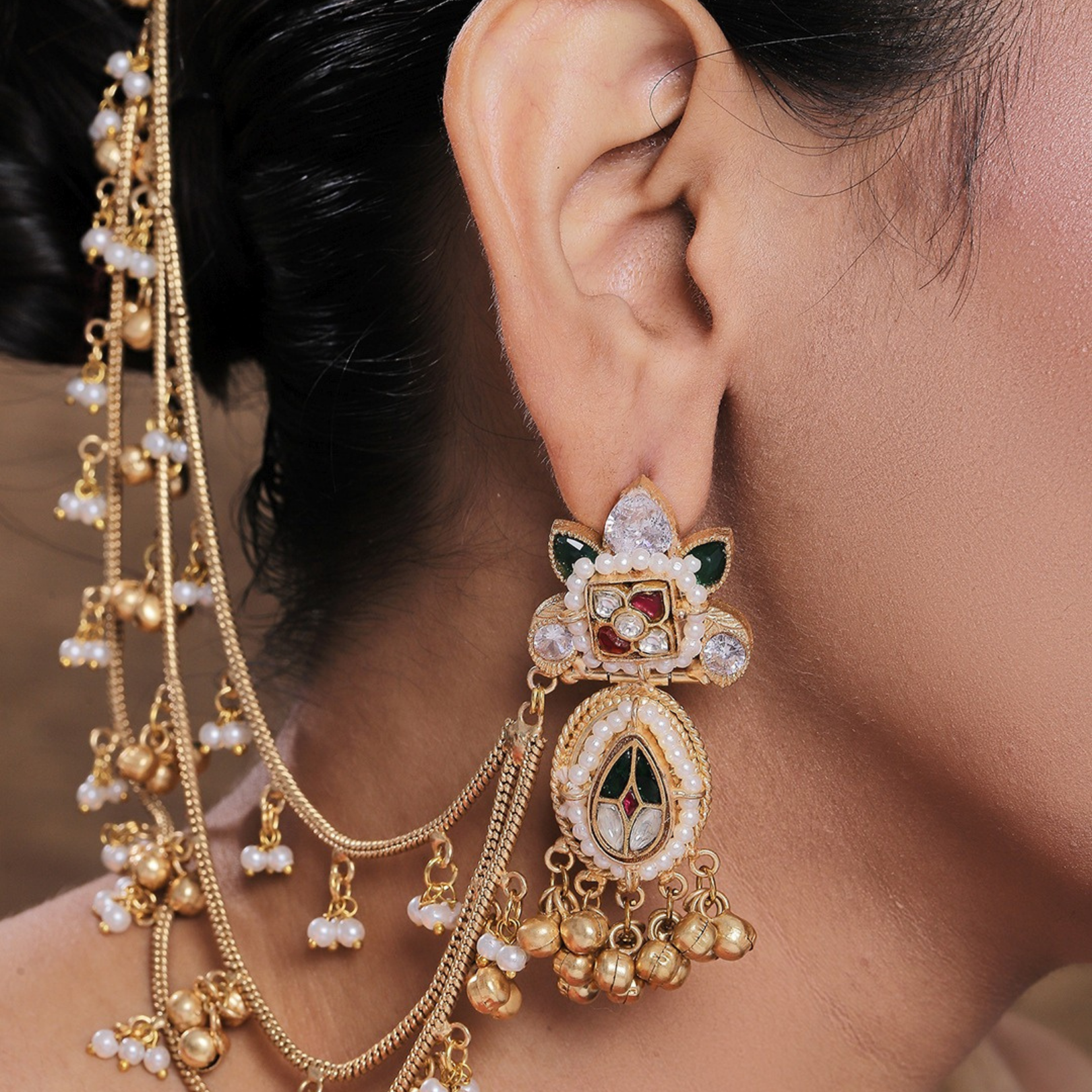 Upgrade your traditional look with the exquisite Gauhar Kashmir Kaan Chain Jhumka. Crafted with intricate details, this earring adds a touch of grace to your outfit. Made from high-quality materials, it is lightweight and comfortable to wear. Elevate your style game with this timeless piece.