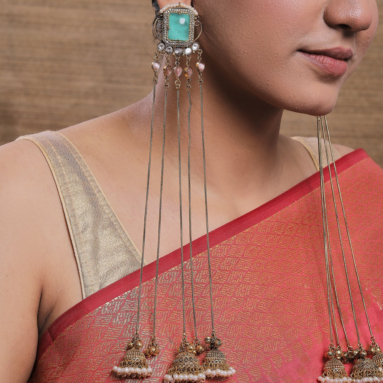 Elevate your elegance with the Nazakat Kashmiri Jhumka, a timeless piece inspired by traditional craftsmanship. Its intricate design and delicate detailing bring a refined charm to any ensemble, perfect for special occasions or adding a touch of sophistication to everyday wear. Crafted to complement your graceful style, this jhumka embodies both heritage and contemporary allure.