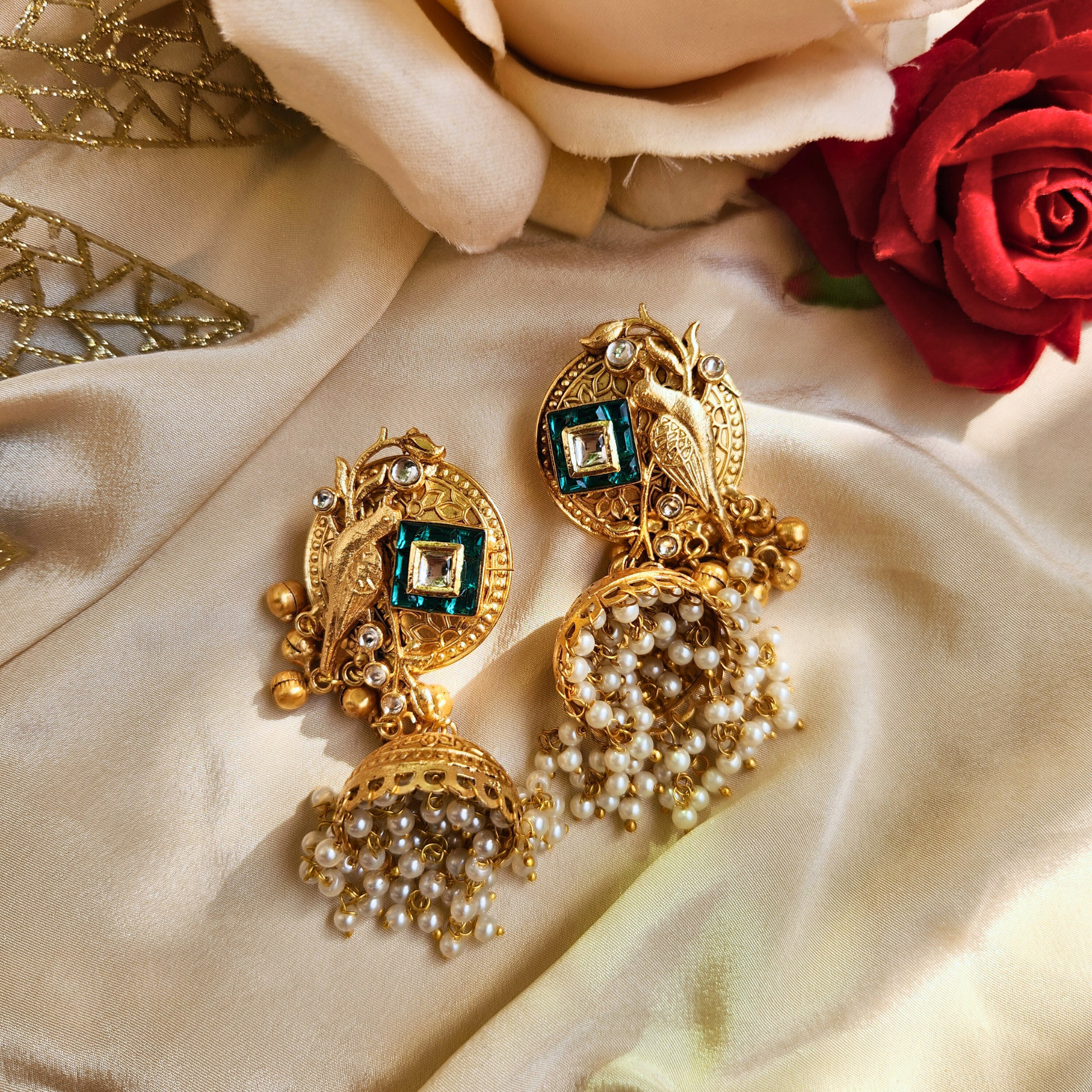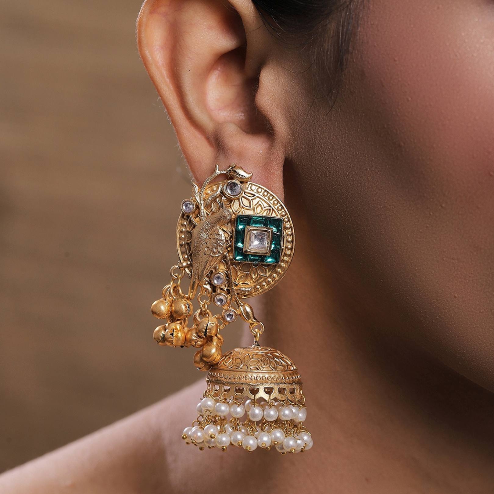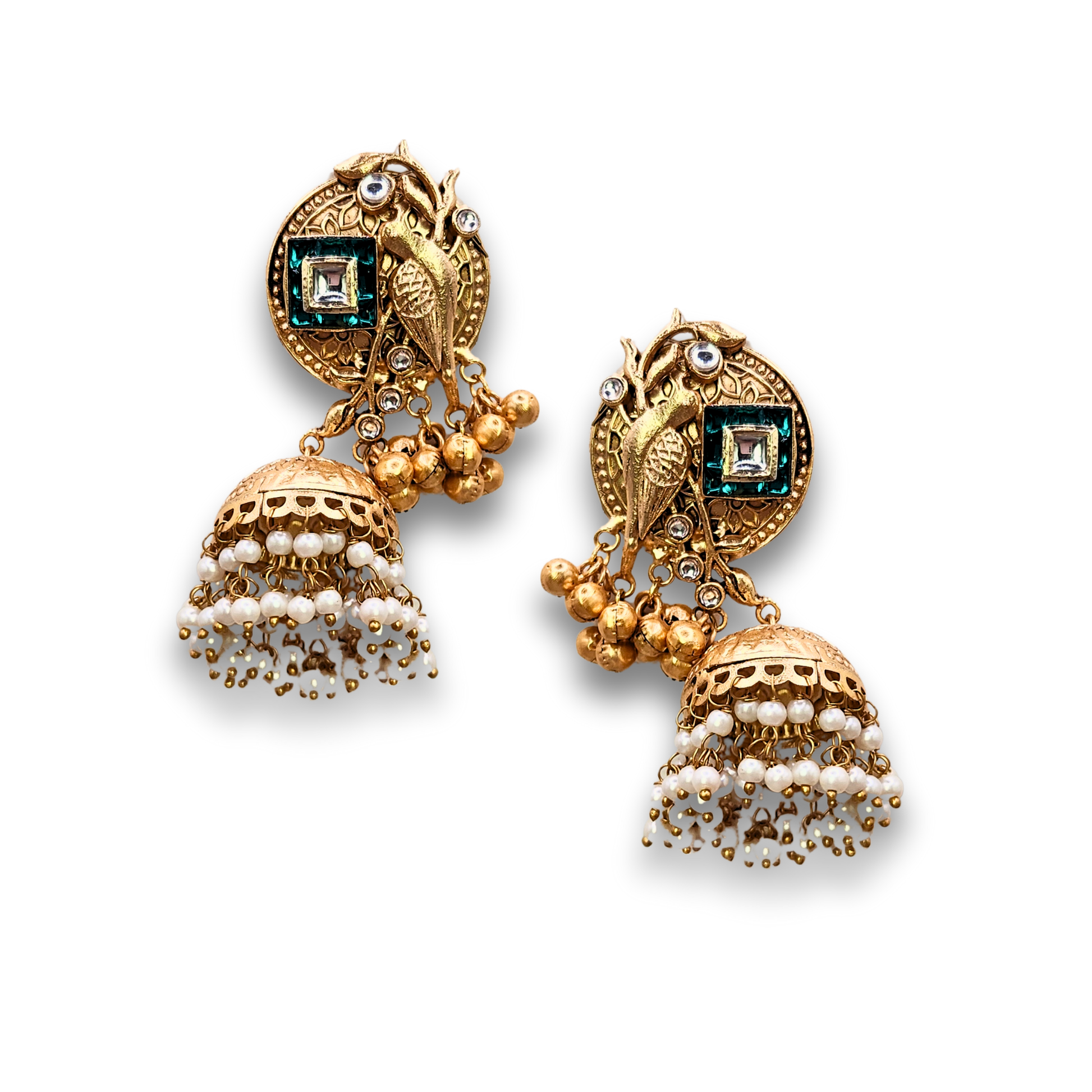 Immerse yourself in traditional Indian artistry with these exquisite Pakeeza jhumka earrings. The stunning design features an antique bird motif crafted in gold-plated metal, adorned with emerald-hued and clear stone embellishments. The top disc showcases intricate traditional patterns with a prominent bird design, complemented by small golden bells. The jhumka dome beneath is beautifully detailed with delicate pearl accents and cascading beadwork that creates an enchanting movement with every step. These statement earrings perfectly blend classical aesthetics with contemporary styling, making them ideal for festivals, weddings, or any special occasion where you want to make a lasting impression. The harmonious combination of antique finish, pearl details, and sophisticated stonework makes these jhumkas a timeless addition to your jewellery collection. Each pair is meticulously crafted to ensure both beauty and durability, allowing you to cherish these elegant pieces for years to come.