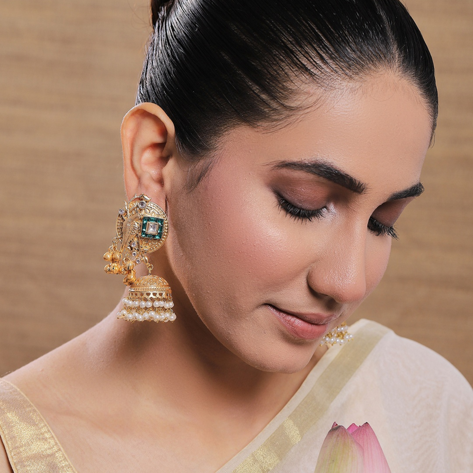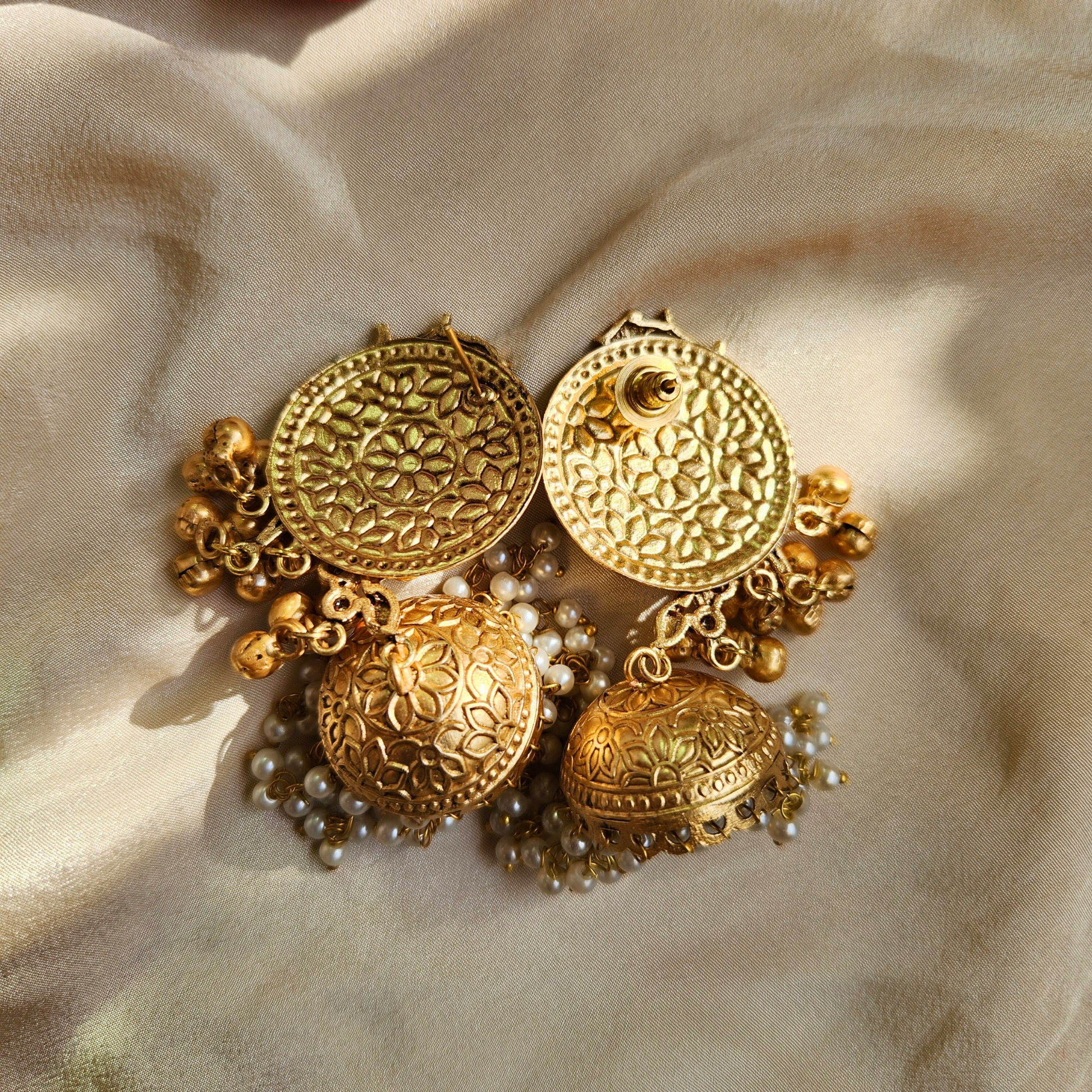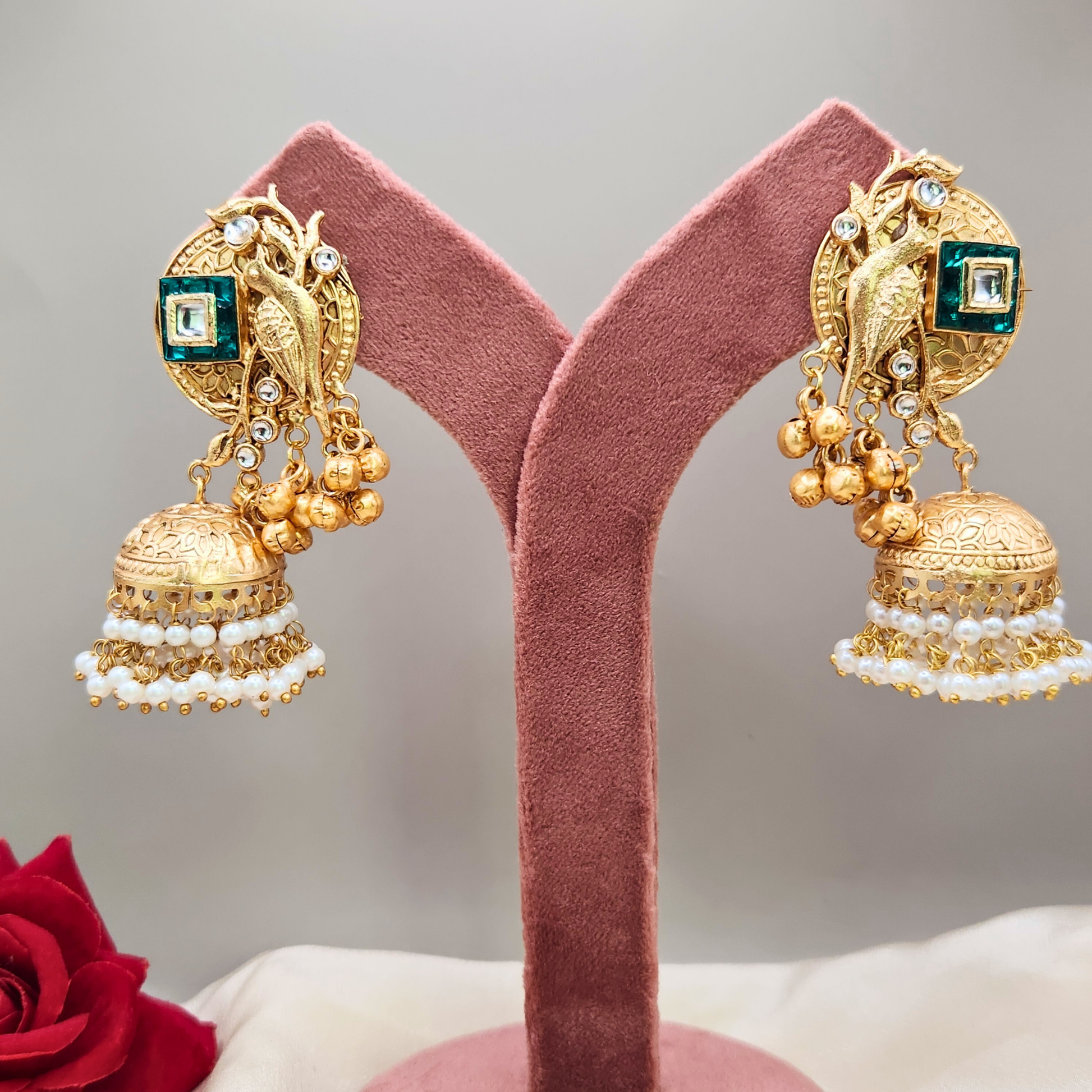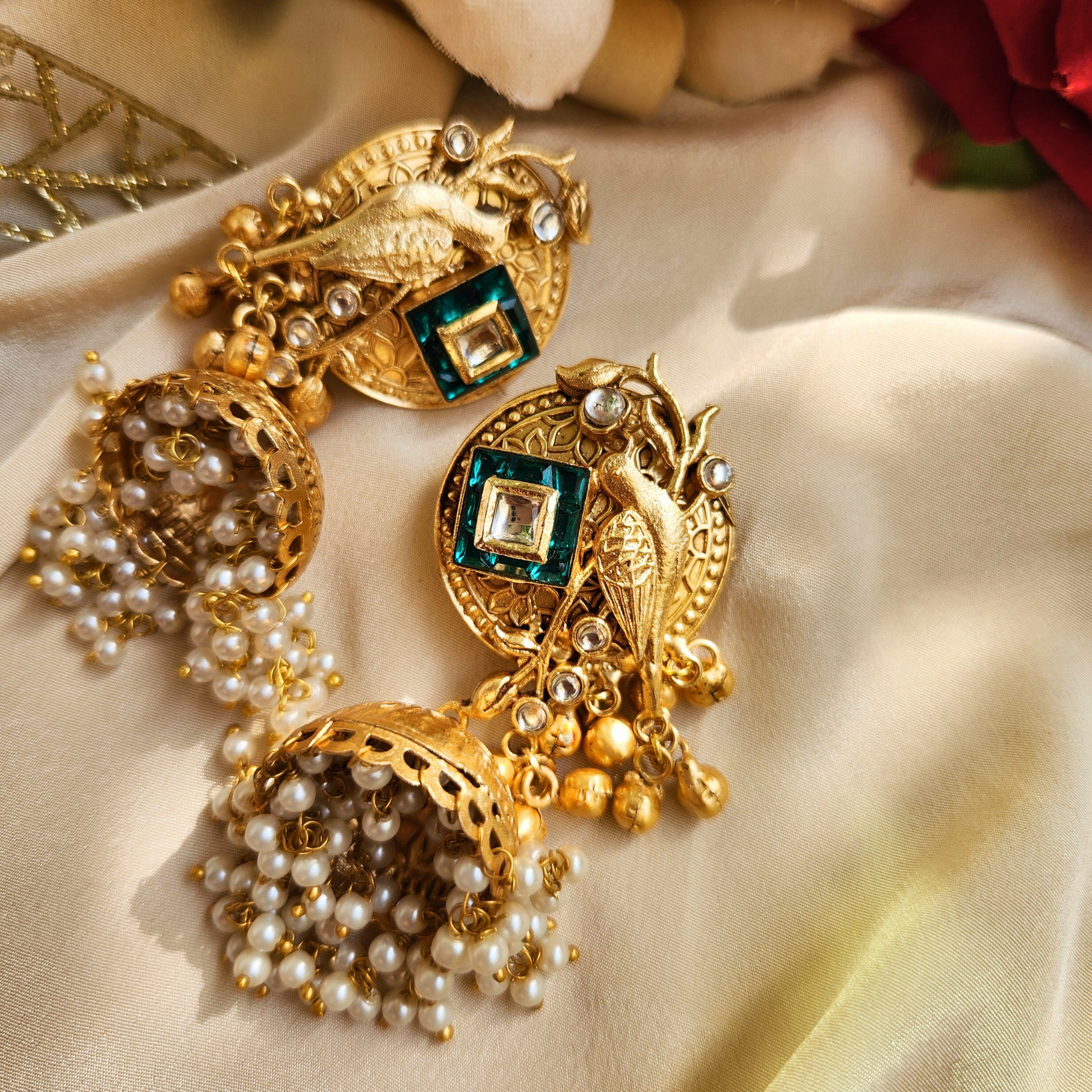 Immerse yourself in traditional Indian artistry with these exquisite Pakeeza jhumka earrings. The stunning design features an antique bird motif crafted in gold-plated metal, adorned with emerald-hued and clear stone embellishments. The top disc showcases intricate traditional patterns with a prominent bird design, complemented by small golden bells. The jhumka dome beneath is beautifully detailed with delicate pearl accents and cascading beadwork that creates an enchanting movement with every step. These statement earrings perfectly blend classical aesthetics with contemporary styling, making them ideal for festivals, weddings, or any special occasion where you want to make a lasting impression. The harmonious combination of antique finish, pearl details, and sophisticated stonework makes these jhumkas a timeless addition to your jewellery collection. Each pair is meticulously crafted to ensure both beauty and durability, allowing you to cherish these elegant pieces for years to come.
