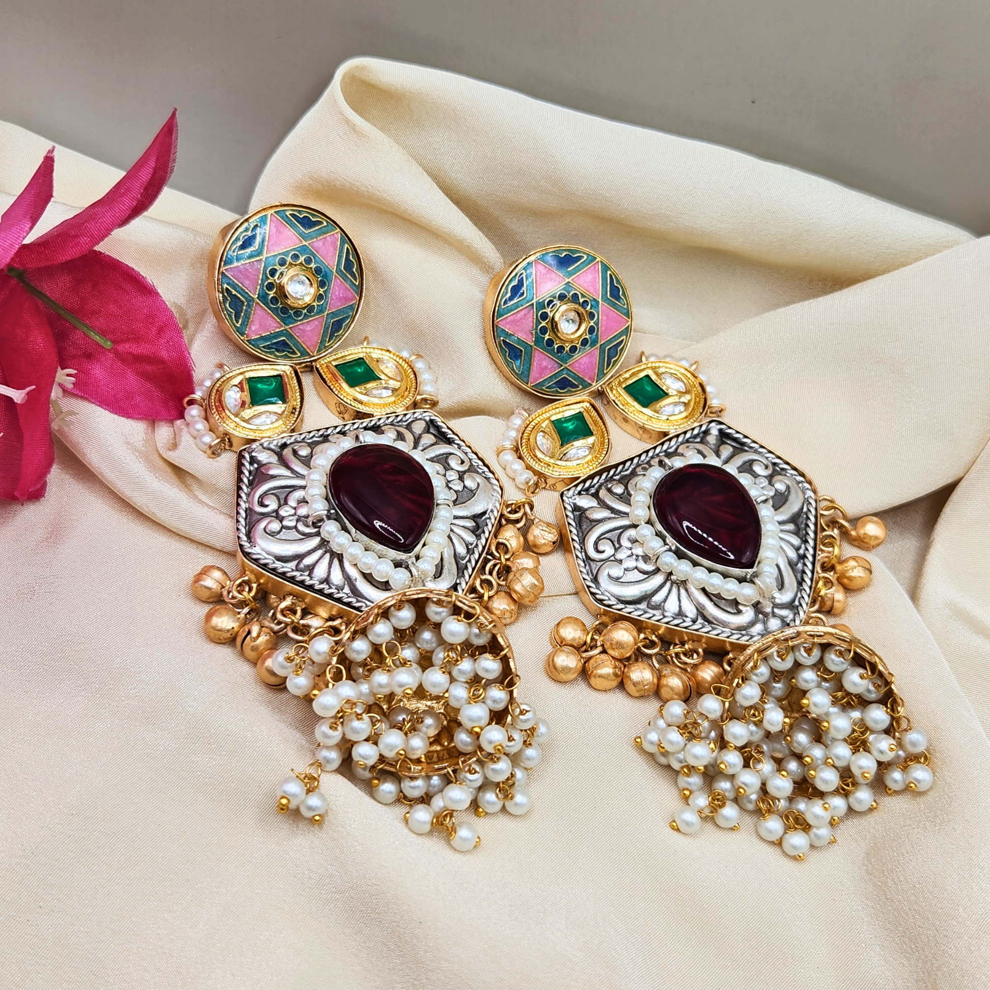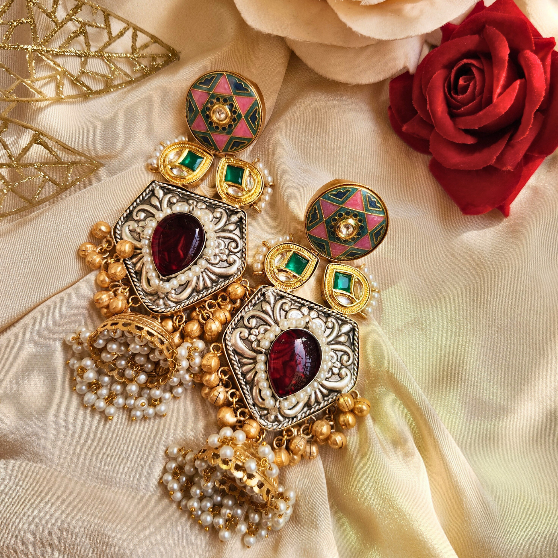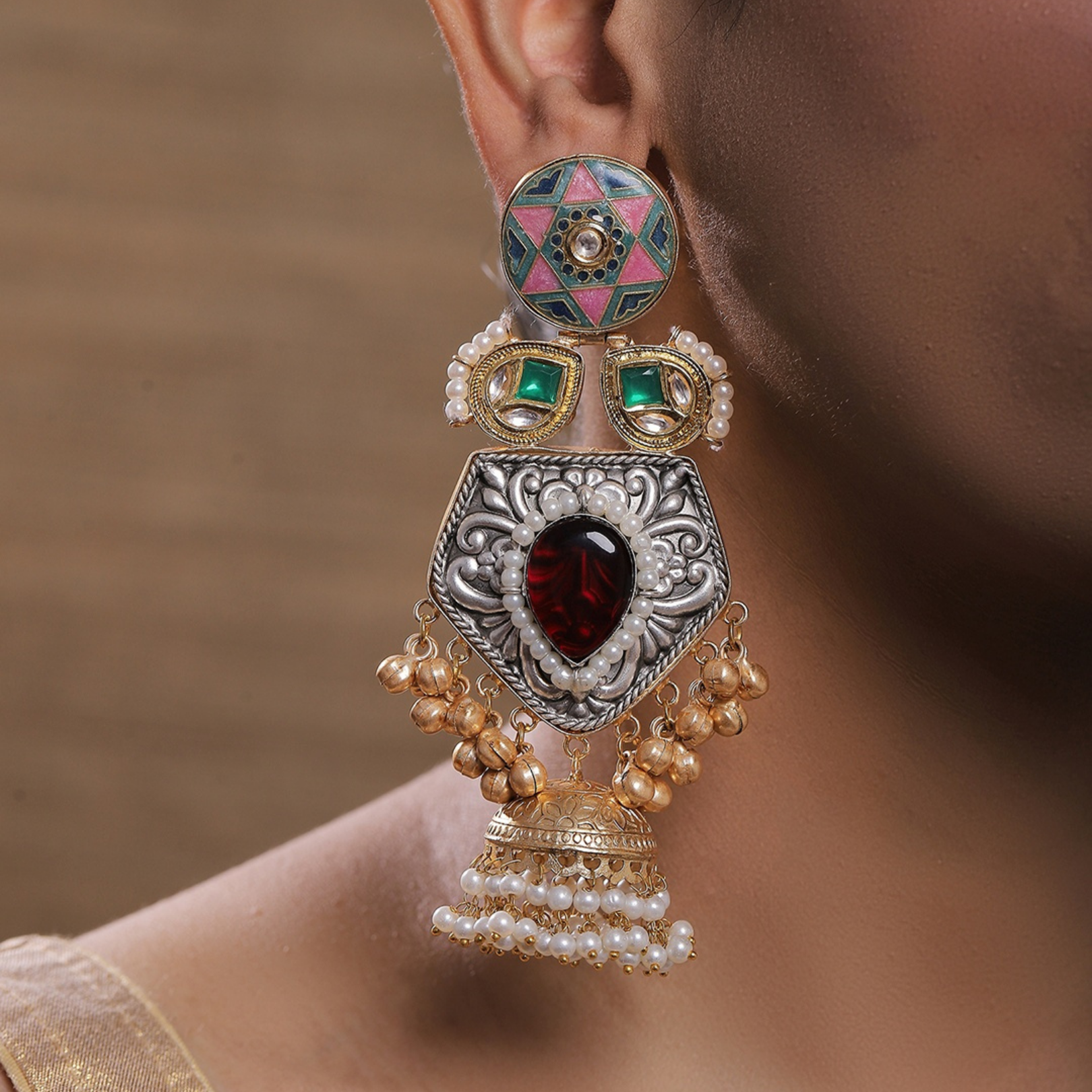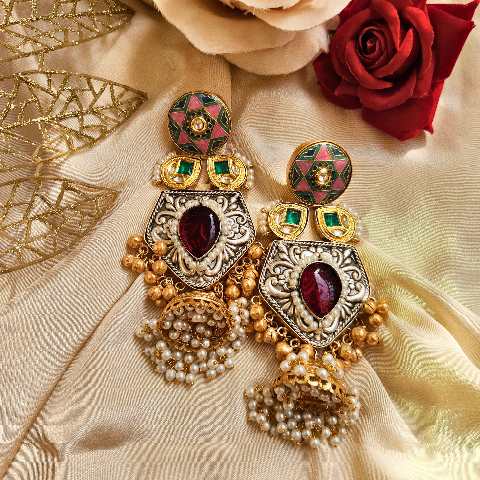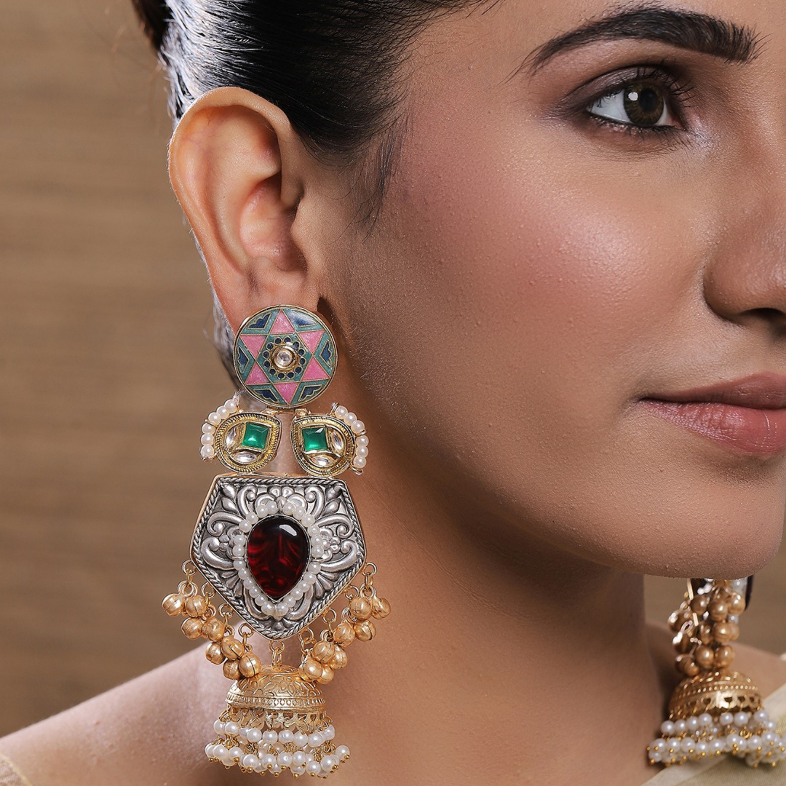 Step into the world of traditional Indian elegance with these exquisite Jhumka earrings. Masterfully crafted with an antique finish, these statement pieces showcase a captivating bird motif adorned with emerald-hued crystals and pristine white pearls. The intricate design features a distinctive top disc with traditional patterns, complemented by emerald-coloured square crystals and delicate pearl embellishments. The 5 cm wide earrings boast a beautifully detailed dome with cascading pearl drops and small golden bells that create enchanting movement. Crafted from premium brass with 18K gold plating, these medium-sized jhumkas feature sophisticated prong settings and secure push-back closures. The harmonious blend of antique-style metalwork, crystal stonework, and pearl detailing makes these earrings perfect for traditional ceremonies, festivals, and wedding celebrations. Each element, from the ornate bird motifs to the dangling pearl cascade, has been meticulously designed to create a timeless piece that adds grace to any ethnic ensemble. These versatile jhumkas weigh a comfortable 50 grams, making them suitable for extended wear during special occasions.