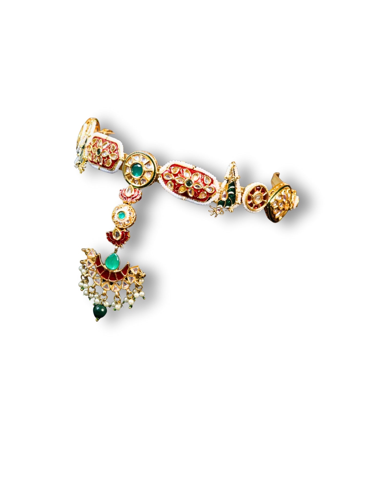 VIANA JEWELS Aditi Maangtikka Hairband blends traditional elegance with modern sophistication. Crafted from premium brass and adorned with dazzling Kundan stones, this headpiece embodies Indian heritage and royal charm. The Aditi design sits beautifully on the forehead, adding an instant touch of elegance to any bridal or festive ensemble. Lightweight and comfortable, it ensures ease of wear throughout weddings, sangeet, or mehendi. Perfect for pairing with sarees, lehengas, or Indo-western gowns, it enhances your beauty and completes your ethnic look. Avoid water, perfume, and hairspray to maintain its shine and elegance.