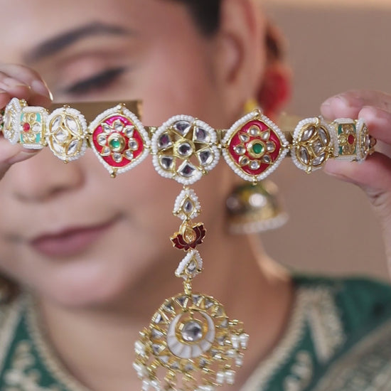 VIANA JEWELS Amrata Maangtikka Hairband brings together the beauty of traditional artistry and modern elegance. Crafted from premium brass and embellished with stunning Kundan stones, this headpiece reflects sophistication and heritage. The Amrata design sits gracefully on the forehead, giving your bridal or festive attire a regal touch. Its lightweight structure ensures comfortable wear for long hours during weddings, mehendi, or cultural festivities. Pair it with lehengas, sarees, or Indo-western outfits to elevate your look instantly. Avoid water, perfume, and hairspray to preserve its lustre and longevity.