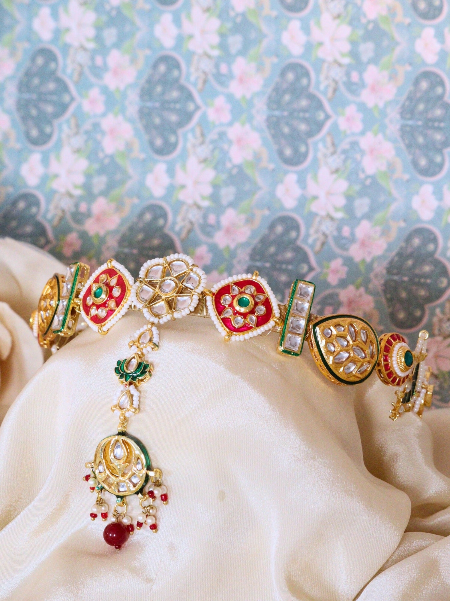 VIANA JEWELS Amrita Maangtikka Hairband is a stunning fusion of elegance and heritage, designed to elevate your bridal and festive look. Crafted from premium brass and embellished with sparkling Kundan stones, this exquisite piece embodies the beauty of Indian craftsmanship. The Amrita design sits gracefully on the forehead, giving your ensemble a royal and sophisticated touch. Lightweight and comfortable, it’s perfect for weddings, sangeet, mehendi, and festive occasions. Pair it with sarees, lehengas, or Indo-western outfits for a complete ethnic look. Keep away from water, perfume, and hairspray to preserve its shine and finish.