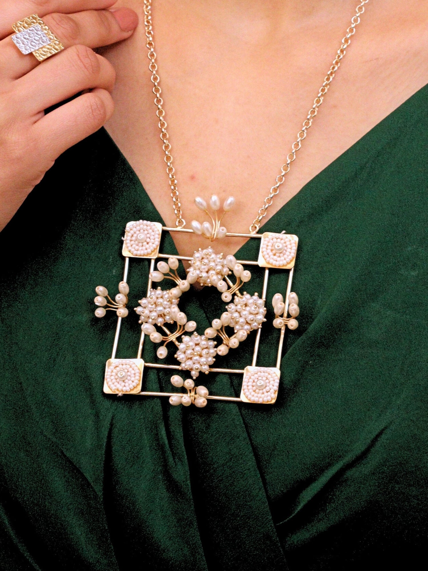 Viana Jewels Kanaka Long Necklace Set with Earrings Brass Pearl Gold Plated