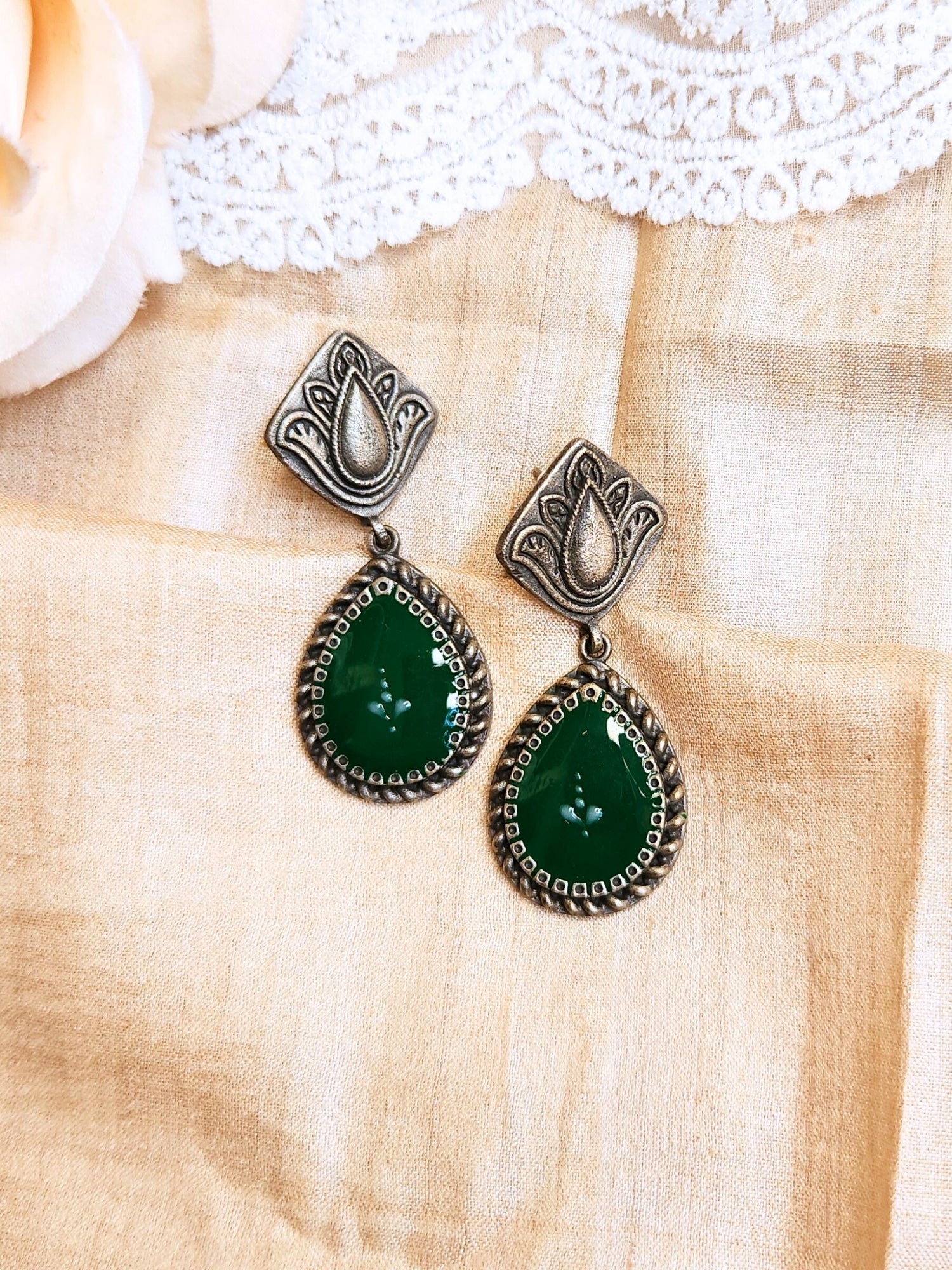 VIANA JEWELS Zareena Chandbali Earrings in yellow showcase exquisite Indian artistry. Handcrafted using premium brass with silver oxidised plating, these earrings feature intricate hand-painted meenakari work. Their elegant crescent design and lightweight feel make them perfect for weddings, festive occasions, and traditional celebrations.